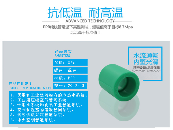 □  管件連接牢固:由于聚丙烯具有良好的熱熔接性能,熱熔連接將同種材料制造的管材和管件連接成為一個整體,杜絕了漏水的隱患。