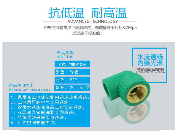 □  管件連接牢固:由于聚丙烯具有良好的熱熔接性能,熱熔連接將同種材料制造的管材和管件連接成為一個整體,杜絕了漏水的隱患。