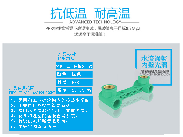 □  管件連接牢固:由于聚丙烯具有良好的熱熔接性能,熱熔連接將同種材料制造的管材和管件連接成為一個整體,杜絕了漏水的隱患。