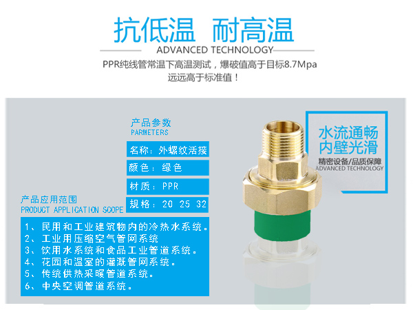 □  管件連接牢固:由于聚丙烯具有良好的熱熔接性能,熱熔連接將同種材料制造的管材和管件連接成為一個整體,杜絕了漏水的隱患。